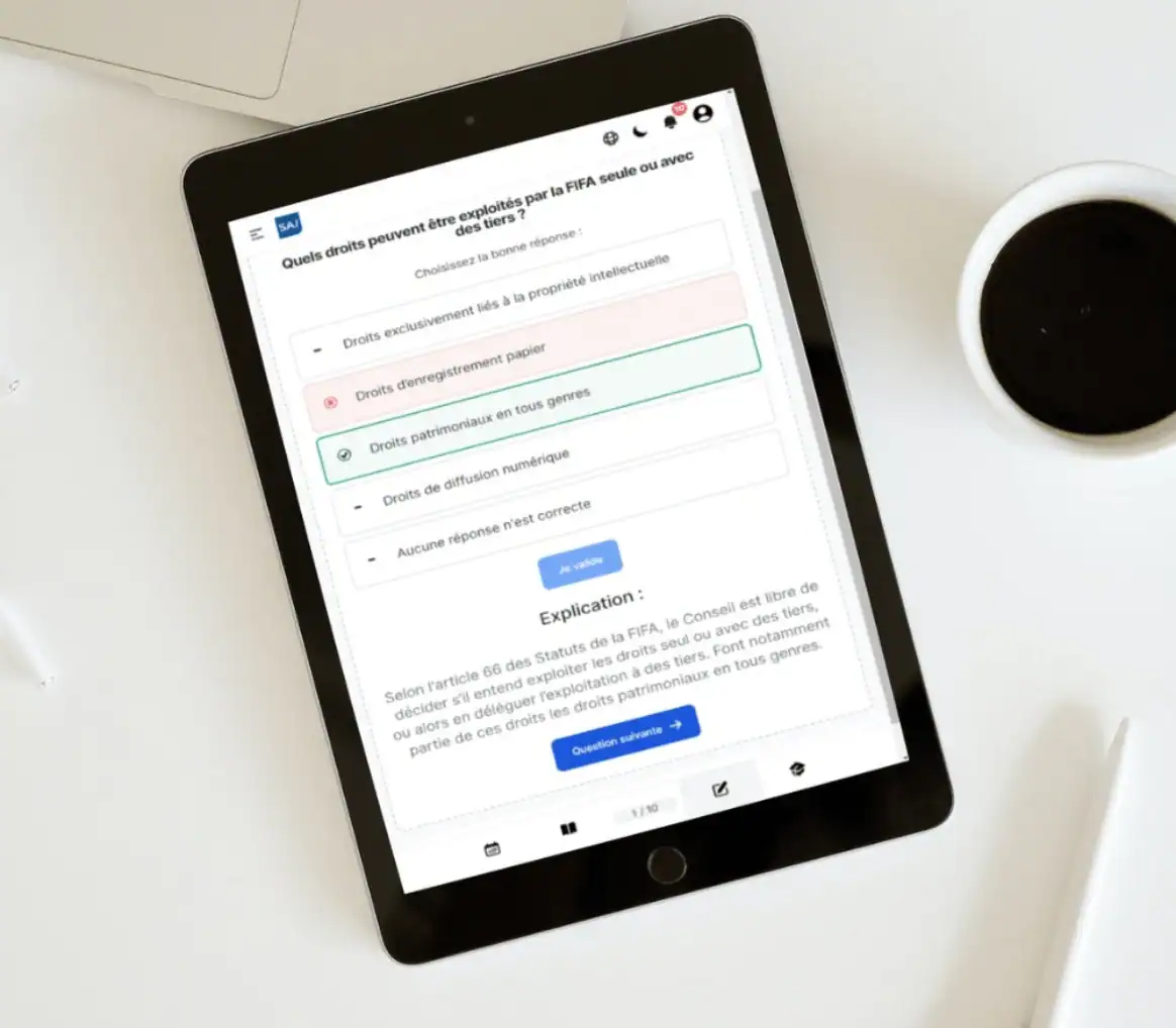 Les QCM de l’examen agent FIFA de SportsAgent Institute couvrent l’entièreté du matériel pédagogique de l’examen d’agent FIFA. Voici une présentation détaillée des QCM que vous allez pouvoir retrouver :